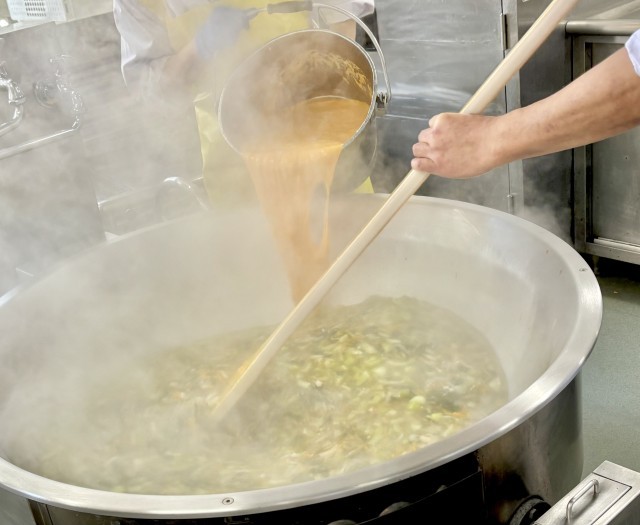 卵スープは、鶏肉、たまねぎ、チンゲンサイ、にんじんを煮て、味つけし、最後に卵を流し入れて仕上げています。(写真2枚目)