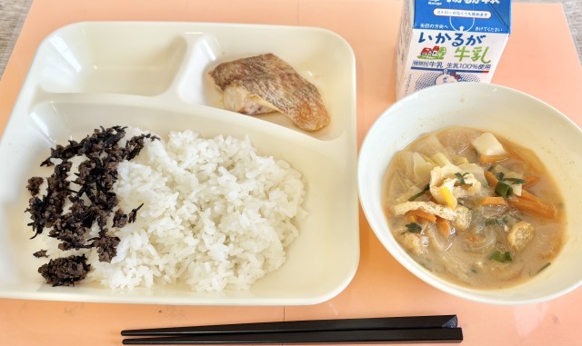 【ごはん、あかうおのレモンじょうゆかけ、みそ汁、牛ひじきそぼろ、牛乳】