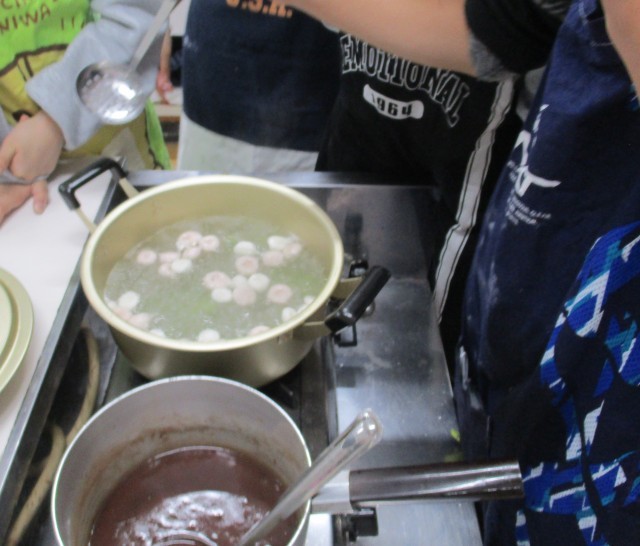 6年生は家庭科の三色だんごを作り、お茶をいれる調理実習をしました。だんごの水かげんが難しく、苦戦した班もありましたが、班の友だちと協力しながら仕上げていました。