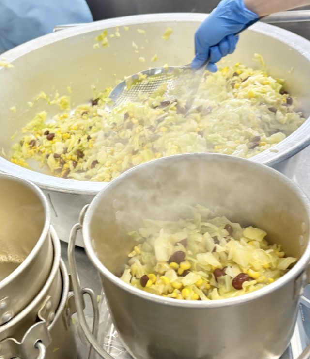 金時豆と野菜のサラダは、金時豆、キャベツ、コーンに砂糖、塩、こしょう、米酢、うすくちしょうゆ、綿実油で作ったドレッシングをかけ、あえています。(写真3枚目)