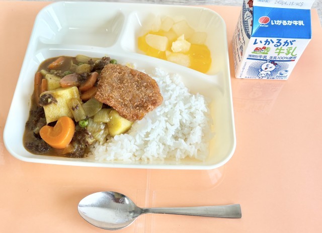 【カツカレーライス、フルーツゼリー、牛乳】