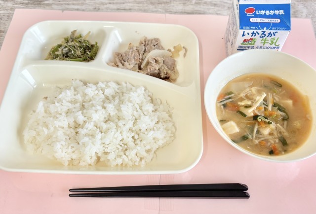 【ごはん、豚肉の甘辛焼き、とうふのみそ汁、じゃこピーマン、牛乳】