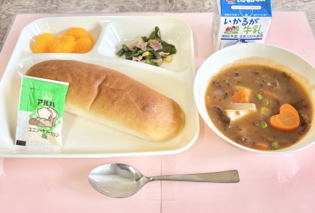 【コッペパン、マーガリン、ビーフシチュー、ベーコンとさんどまめのソテー、みかん缶、牛乳】