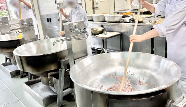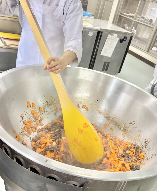 ビーフシチューは、ケチャップ、トマトピューレ、米粉のデミグラスソース、トンカツソース、チキンブイヨンなどで味つけし、上新粉でとろみをつけて煮こんでいます。米粉のデミグラスソースを使用することで、コクや旨みを出すようにしています。(写真3枚目)