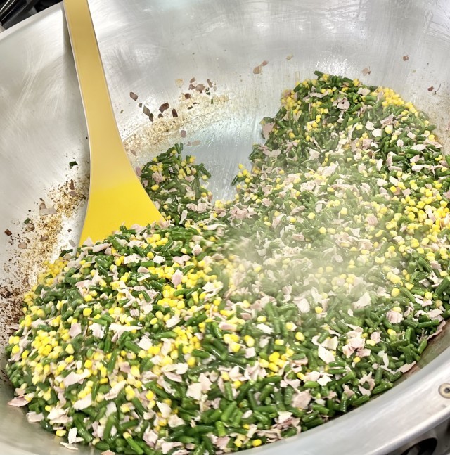 ベーコンとさんどまめのソテーは、ベーコン、さんどまめ、コーンをいため、塩、こしょうで味つけしています。(写真4枚目)