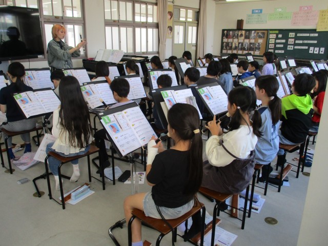 4年3組は音楽室でリコーダーの練習をしていました。