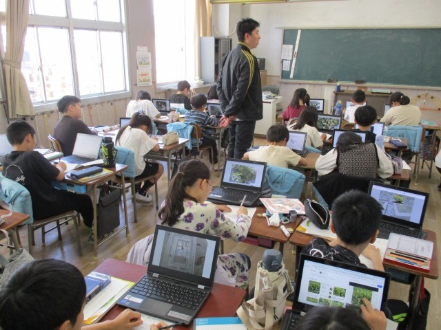 2組は、学習者用端末を使って、校内で見つけた「春」を記録していました。