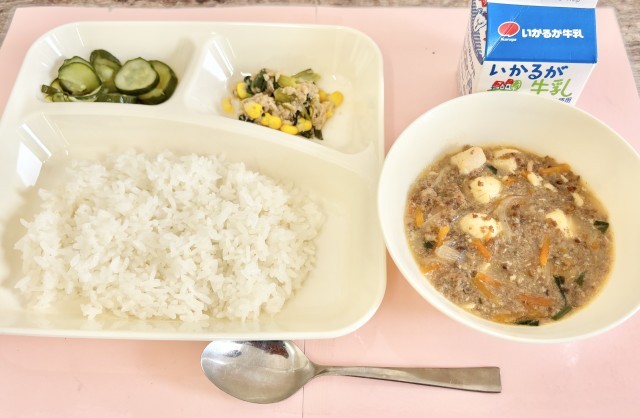 【ごはん、マーボーどうふ、きゅうりの中華あえ、ツナとチンゲンサイのいためもの、牛乳】