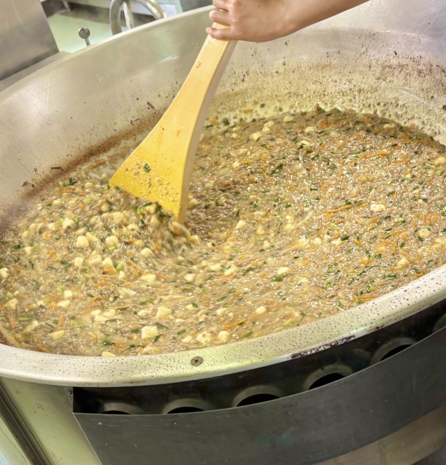 マーボーどうふは、香りよくいためたしょうが、にんにく、トウバンジャンと、牛ひき肉、豚ひき肉、とうふ、にんしまん、たまねぎ、にらを使用した子どもたちに人気のマーボーどうふです。(写真2枚目)