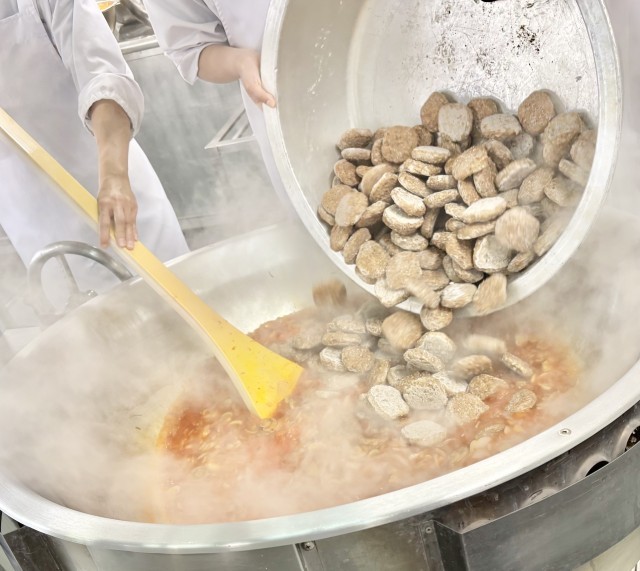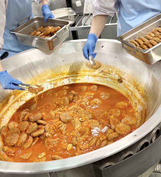 煮こみハンバーグは、いためたたまねぎ、マッシュルーム、ケチャップ、ウスターソースでハンバーグをじっくりと煮こみ、火をきって、しばらく置いて仕上げています。(写真2、3枚目)