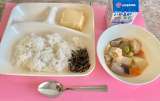【ごはん、鶏肉と野菜の煮もの、ひじき豆、かぶのゆず風味、牛乳】 鶏肉と野菜の煮...