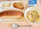【黒糖パン、カレーマカロニグラタン、てぼ豆のスープ、ぶどうゼリー、牛乳】 カレ...