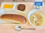 【黒糖パン、焼きハンバーグ、豆乳スープ、ダイスゼリー(みかん)、牛乳】 2学期...