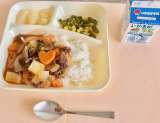 【チキンカレーライス、キャベツとコーンのサラダ、ミニフィッシュ、牛乳】 チキン...