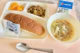 【コッペパン、ブルーベリージャム、カレーマカロニグラタン、豚肉と野菜のスープ、み...
