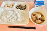 【ごはん、酢豚、中華みそスープ、まっ茶大豆、牛乳】 酢豚は、たまねぎ、たけのこ...
