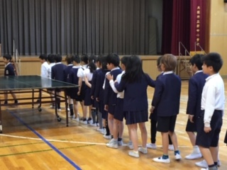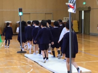 交通安全指導がありました。集団で歩いたり、横断したりする時に交通ルールを守って、安全に行動するために、講堂に作った模擬道路で集団歩行の練習をしました。「一人ひとりが自覚して、道路や周りの状況をよく考えて行動するように!」というめあてを守って、正しく安全に歩くことができました。本番でも、ルールやマナーに気を付けて安全に行動してほしいと思います。