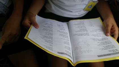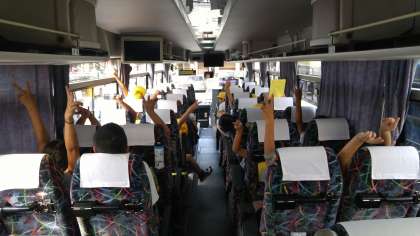 バスの中では、子ども達が手作りした「歌集」を見ながら、仲良く歌を歌い、とても楽しく過ごしています。