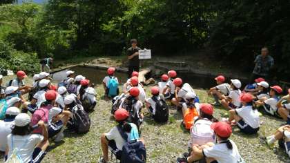 大自然の中を歩いて、川に到着しました。スタッフの方から「ヤマメ」と「アマゴ」の特徴を教えていただき、魚つかみのスタートです。上手に捕まえるとこができるかな?