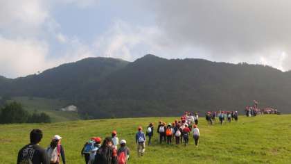 間違い探しをクリアした班から、山登りをスタートしました。日差しがきついですが、風のおかげでとても涼しく、見通しもとても良好です。約2時間かけて頂上まで登り、ゴールの宿舎やまなみまで下りてきます。