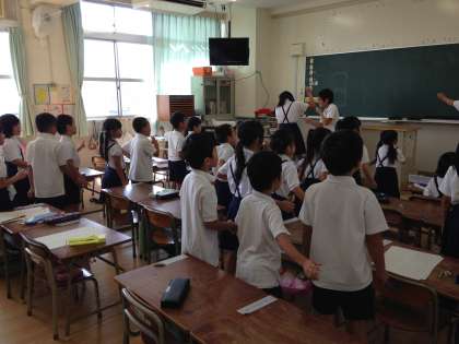 高学年の、応援団のお兄さん、お姉さんから、応援合戦の歌「ゴーゴーゴー」の踊りを教わりました。応援団のお兄さん、お姉さんはとてもかっこよくて、1年生は目をキラキラさせていました。赤組も白組も一生懸命頑張っています。本番が楽しみですね。