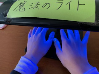 自分で手洗いをして、でどれくらいきれいになっているかを実際に体験しました。爪の間、指と指の間など、細かいところで洗い残しが見られました。