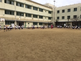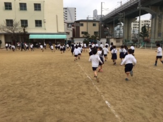 15分休みの「かけ足タイム」の様子です。かけっこの時のように力一杯に速く走るのではなく、自分に合ったペースを保ちながら呼吸を整えて10分間走り続けることが目標です。初めの頃は、「速く走りたい!」という気持ちがあふれて、「ダッシュ」してしまう子ども達。後半は当然、「疲れたー!」とペースダウンしてしまっていました。しかし、今では「スッスッハッハッ」と呼吸を整えて走る事ができるようになってきました。「元気いっぱいに走って、寒さを吹き飛ばすぞー!」