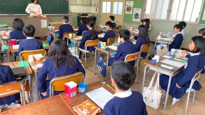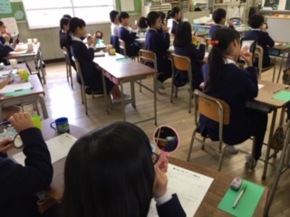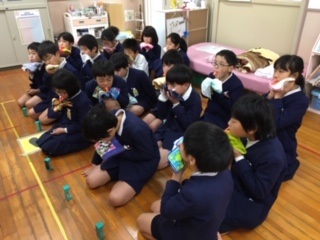24日、歯磨き指導とフッ化物塗布がありました。教室で歯科衛生士さんから虫歯になるわけとフッ素塗布の仕方を教えていただきました。虫歯菌が食べかすについて歯垢となり、酸が砂糖に変わって歯を溶かし虫歯になること、フッ素が歯を固くし虫歯になりにくくなること、分けて何回もだらだらおやつを食べると虫歯になりやすいこと、唾液が虫歯菌を掃除してくれることなどを楽しく学びました。その後、歯磨きをしてきれいになったところで、保健室に移動してでフッ素塗布をしました。