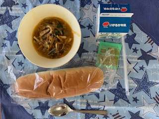今日の給食は、マーボーはるさめ、大型コッペパン、牛乳、りんごジャムでした。おいしくいただきました!!