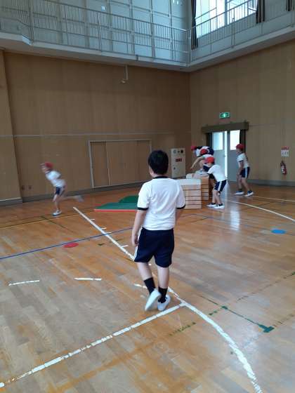 授業のメインは、跳び箱や平均台を使ったサーキットリレーです。跳び箱に飛び乗ったり、落ちないように平均台を渡ったり…。友だちと競争したり、応援したりしながら盛り上がった活動となりました。