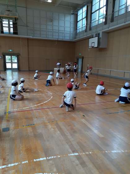 待ちに待った、体育の学習では体づくり運動に取り組みました。まずは、いろいろな走り方にチャレンジです。後ろ向き走り、くも走り、ボールはさみ走り、ギャロップ走り…。縄とびにも挑戦しました。久々の体育で、疲れた様子も見られましたが、子どもたちはいきいきと楽しそうに活動していました。