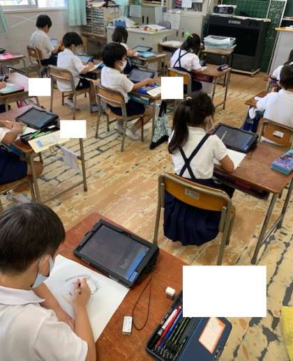 タブレットを使って、自分の顔の写真を撮りました。撮った写真で眉毛や目、鼻などパーツごとにみて、紙に絵をかきました。タブレットのズーム機能を上手に使ってじっくりと見ることができました。