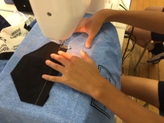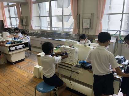 家庭科の「生活を楽しく ソーイング」でエプロンを作りました。すきなキャラクターや模様の布地を裁ち、アイロンをかけ、しつけをしました。「玉結び、できた〜。」「玉どめ、どうするんやったあ?」と5年生での学習を思い出しながら、楽しそうに取り組みました。ミシン縫いが始まると、上糸の通し方、下糸の出し方、下糸の出し方など友達同士で教え合いながら一人一人完成に近づいていきました。そして、完成したエプロンをつけてうれしそうに見せ合っていました。