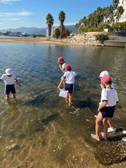 海のグループでは、11月ということで海に入れるか心配していましたが、天候にも恵まれ、暖かい日差しの中、上靴に履き替えた子どもたちは次々と海に入っていきます。ヤドカリや小さな生き物を見つけては、友だちと見せ合ってビニール袋に入れていました。