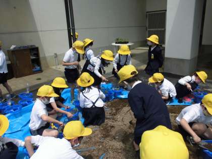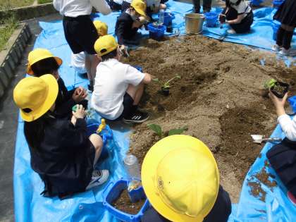 先日、生活科「ぐんぐんそだて わたしの野さい」の学習で、届いた野菜の苗を学習園や自分の鉢に植え替えました。