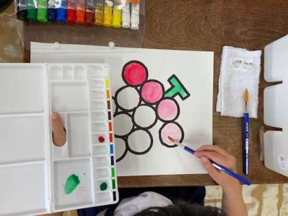 そして、いざ挑戦です。今回は「カラフルなぶどう」をテーマに、一人ひとり好きな色を丁寧に塗っていきました。中には、水の量を調節して濃淡をつけたり、模様をつけたりと、自分なりの工夫をしている子もいて、驚かされました。