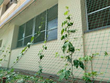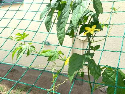 写真は植え替えて1ヶ月経った状態です。ウリ科の植物はこれから夏にかけてぐんぐんと成長します。もしかすると…3階の教室まで登ってくるかも!?
