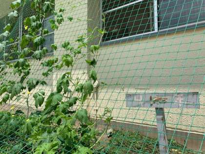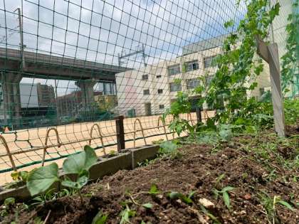 5月末に植え替えたニガウリがついに1階校舎の高さを越えました!!そして、育ちの悪かったヒョウタンが植え替えにふさわしい状態に育ったので、ようやく植え替えです☆
