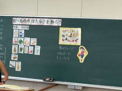今回は、「食べ物のはたらき」について学びました。まず、黄・赤・緑のグループのそれぞれのはたらきを教えてもらいました。そして、給食に使われている食材がどのグループになるのかを考えていきました。