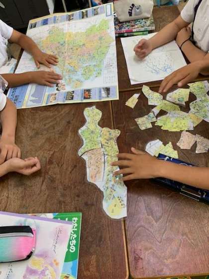 社会科で大阪市24区パズルを使って班で大阪市24区の場所を確認しあいました。