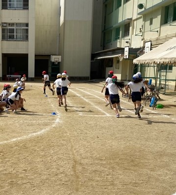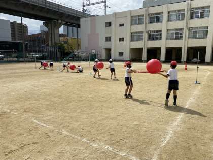 5年生は、第1部の団体競技の救急隊員出動‼とリレー〜みんなでつなごう〜の2つに出場します。団体競技では、棒で挟んだボールを落とさないように2人で運びます。初めはボールを落としたり、慎重になりすぎてゆっくりだったりしたのが、慣れてくると小走りで素早く運ぶことができるようになってきました。
