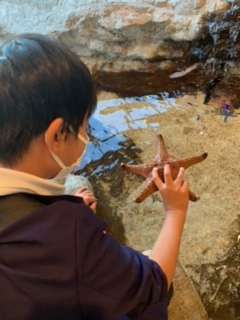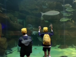 宮島水族館を見学しています。大きな水槽の中にクエもいました。ナマコやヒトデを直接触れるコーナーもあり、みんな元気いっぱいで楽しんでいます。
