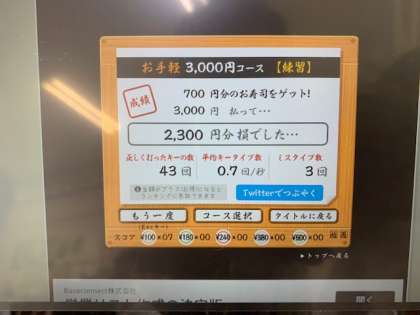 使用したソフトは『すし打ちタイピング』…プレイグラムとちがい、運指が見えません!しかも…すしが流れている間に文字入力をしないといけないという制限時間つき…。