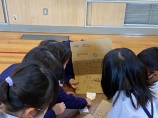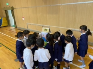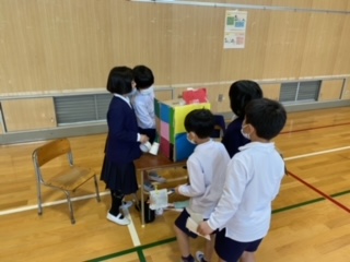 生活科では、うごくおもちゃを作りました。材料調達から工作まで、長期間にわたって頑張りました。「どうすればよくうごくのか。」失敗を重ねながら考えてきました。思い通りにうごかないことが多く、そのたびにみんなで知恵を出し合い、うごくおもちゃを作り上げました。また、ゲーム性を持たせるためにルールをつくり、得点・景品なども決めました。おもちゃランド開催の日、子どもたちからは「きんちょうするなぁ。」「うまくいくかなぁ。」という声をよく聞きました。いざ、1年生が来客すると「いらっしゃいませー!」「こっちにきてくださーい!」と元気よく声を出していて、とても良い雰囲気で始まりました。1年生と交流しているときにも、遊び方やルールをやさしく教えていて、2年生としてとても立派でした。1年生から「もっとあそびたい!」という声を聞き、2年生もうれしかったようです。