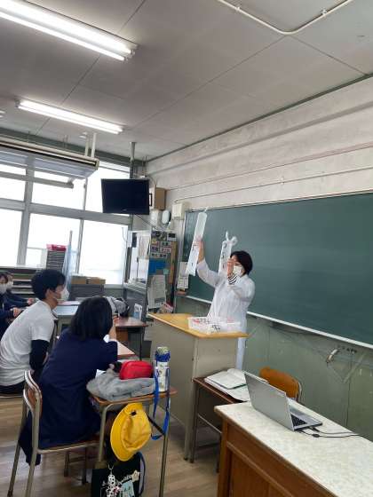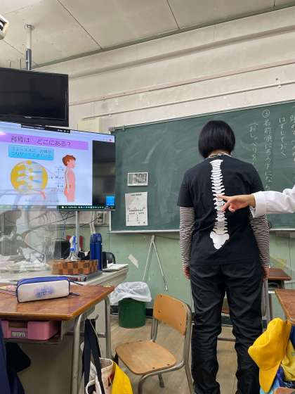 そのあと、養護教諭の足立先生に正しい姿勢の指導をしていただきました。「姿勢ただしさん」と「姿勢よし子さん」が背骨の状態がわかるTシャツを着て登場し、良い姿勢・悪い姿勢の時、背骨がどうなっているか見ました。授業中、猫背になったり、頬杖をついたりすると、背骨が傾き、この状態が長く続くとゆがんた状態になり、病気になることもあるそうです。また、猫背の時には正しい姿勢の時より息を吸ったり吐いたりする量が少ないことも実際にやってみて確認しました。正しい姿勢の時はしっかり息が吸えるので、脳にも十分な酸素がいきわたり、活動を助けてくれるそうです。正しい姿勢で学習することが効率アップにつながるんですね!
