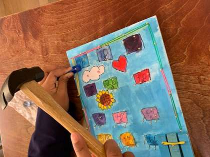 木切れにくぎを打つ感触を楽み、いろいろと試していく中で金づちやくぎを適切に扱うことができました。
