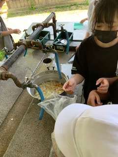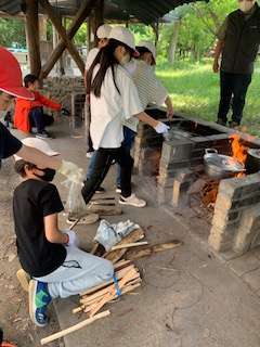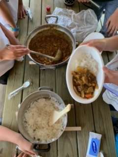 具材を切って、米をとぎ、水をはかり作っていきました。それぞれが役割を分担して協力して作りました。計量カップがないので、手の甲まで水を入れると教えていただき慎重に測っていました。自分たちががんばって作ったカレーは格別においしかったようです。みんなお腹いっぱいいただきました!
