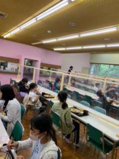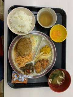 1日中たくさん動き活動した子どもたちはお腹ぺこぺこです。「やっと、夕食か!」と心待ちにしている子がたくさんいました。今日のメニューは和風卸ハンバーグ&唐揚げです。メニューを見て子どもたちは大喜び!!みんなもくもくと食べています。
