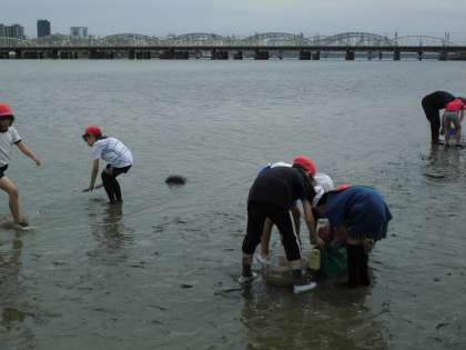 干潟を歩く感触を体験したり、生物を観察したりして、活動を楽しむことができました。特に、カニや魚を見つけた時は、大興奮している子どもたちの姿が見られました。子どもたちは干潟探検を楽しみ、予想以上に衣服や靴が汚れてしまった子もいて、お洗濯等大変ご苦労おかけしたことだと思います。