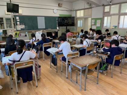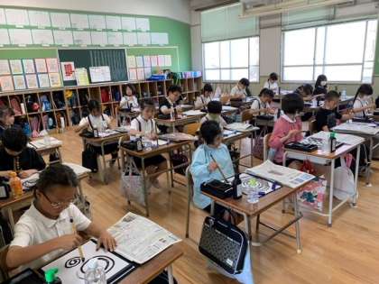 先週は初めての書写の時間がありました。はじめにピカピカの書写バックから硯や下敷き、文鎮などを取り出し置き場所をみんなで確認しました。筆の使い方を学び、いざ筆に墨をつけるときになるとドキドキ!本当につけていいのかな?筆が汚れちゃう。と様々な声が上がりました。筆にたっぷり墨をつけいろいろな線を書きました。筆で書く楽しさを味わえたようでした。
